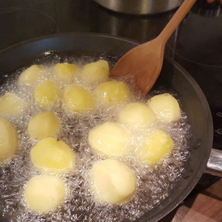 Jak stwierdzimy, że wystarczy - odcedzamy i ostudzamy (aby można było wziąć je w rękę) - każdy ziemniak musi zostać nakłuty w kilku miejscach wykałaczką.