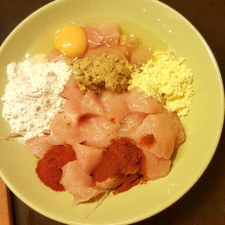 500g kurczaka kroimy w kostkę (około 3-4cm), dodajemy wszystkie składniki marynaty, dokładnie mieszamy, zawijamy i wkładamy na 30 minut do lodówki.