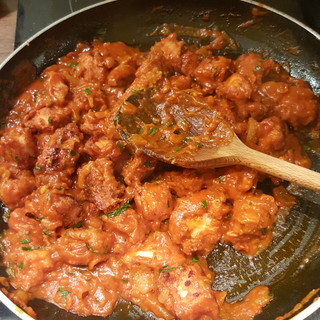 Następnie do dużej patelni wlewamy 3-4 łyżki oleju (tego od kurczaka), rozgrzewamy dodajemy 1/2 łyżki pasty czosnkowo-imbirowej, posikaną cebulę, papryczkę. Delikatnie rumienimy. Dodajemy 1/2 łyżki octu, łyżkę wody, trochę ketchupu, 1/2 łyżeczki chili, łyżeczkę słodkiej papryki, 1/2 łyżki przecieru pomidorowego, kardamon. Wszystko mieszamy i chwilę trzymamy na patelni.
